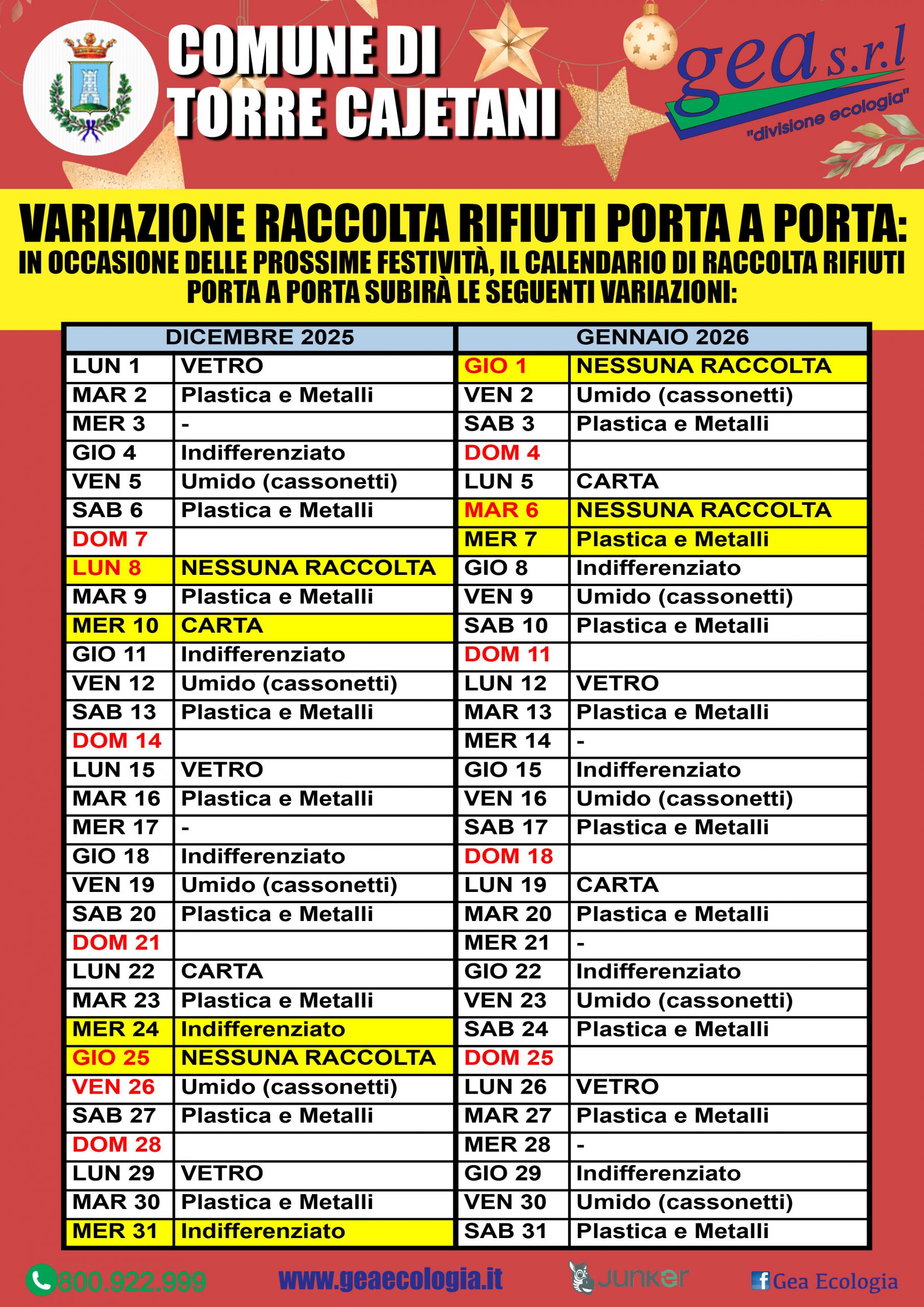 Scarica il calendario della raccolta differenziata del Comune di Torre Cajetani