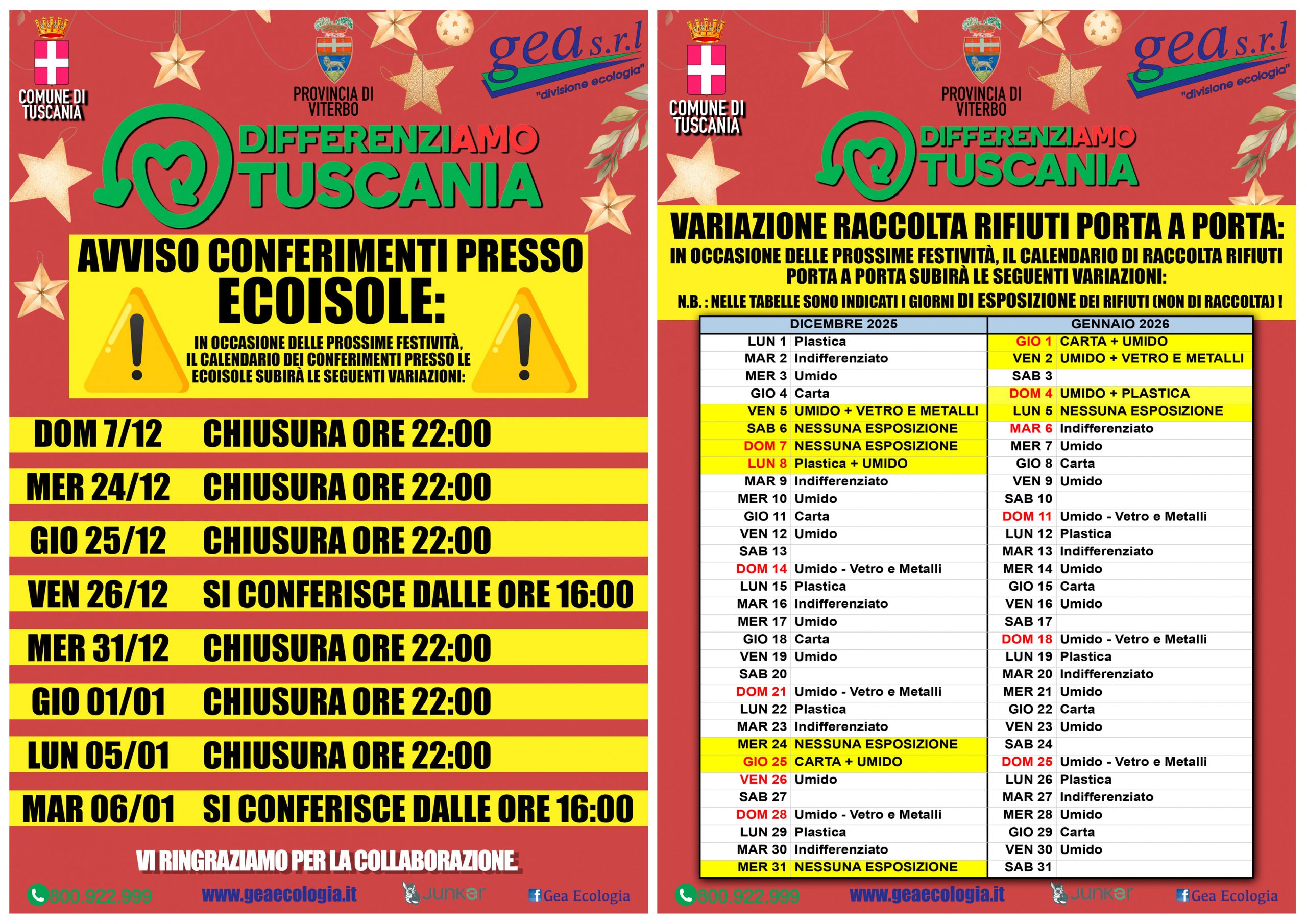 ![]() | Isola Ecologica di Tuscania | Isola Ecologica | Loc. Pratino – Strada Arlenese km.1.95 |